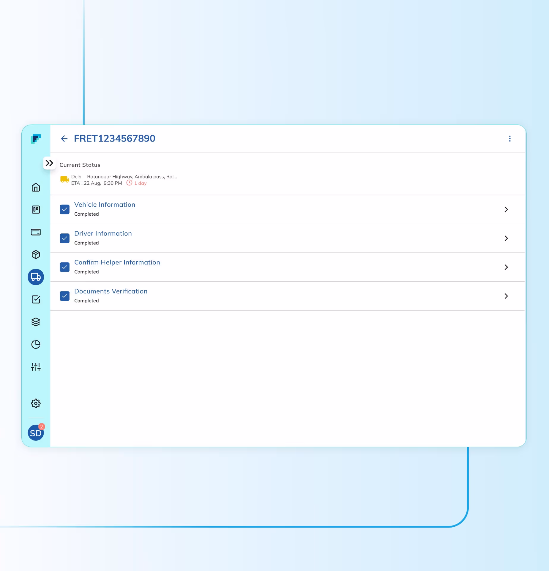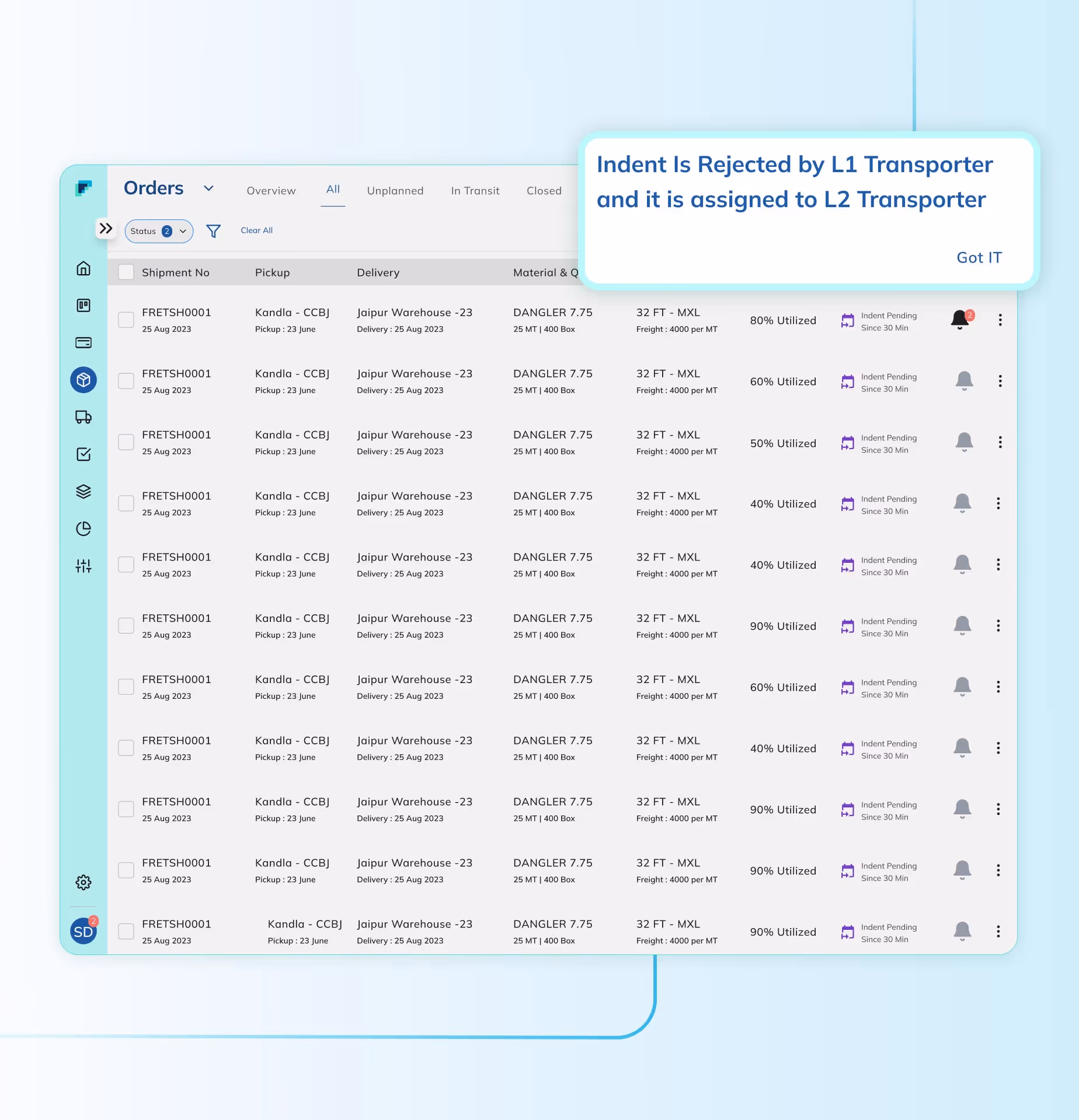 Fretron’s AI pulls orders from your ERP & clubs them into optimal loads. Each load is matched with the right vehicle & transporter considering real-world factors like vehicle availability, costs, SLAs, route efficiency & many others. You can create such load plans in under 30 minutes!
