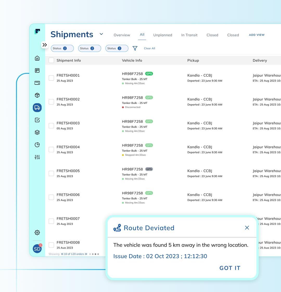 Get real-time fleet visibility, route deviation alerts, and trip status updates across every shipment.